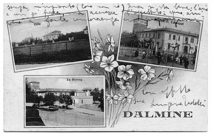 | Tre vedute di Dalmine adagiate su una composizione floreale di violette. Cartolina virata in seppia, spedita il 16-04-1915 |