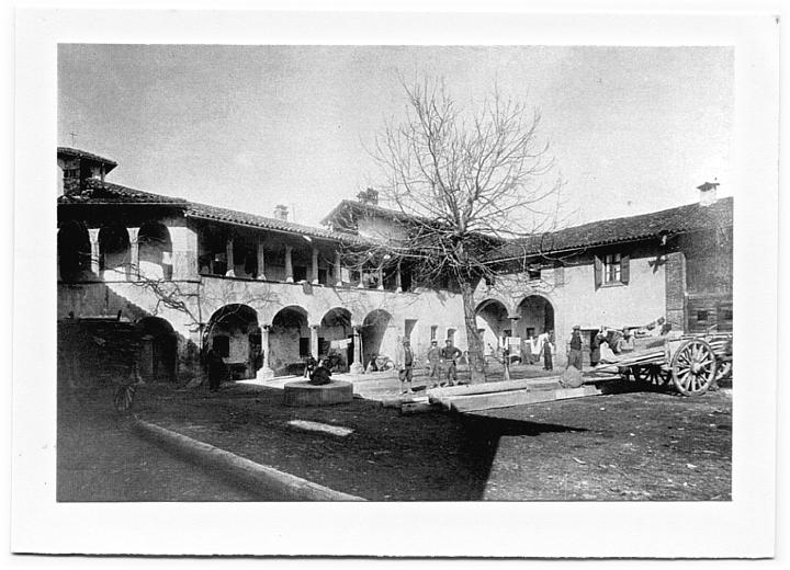 | Cortile interno dell'ex casa colonica "Camozzi" gia' proprieta' dei Canonici Lateranensi di Santo Spirito. Demolita nel 1937 per far posto al parcheggio autubus di Piazza Risorgimento. Cartolina spedita il 07-03-1948. |