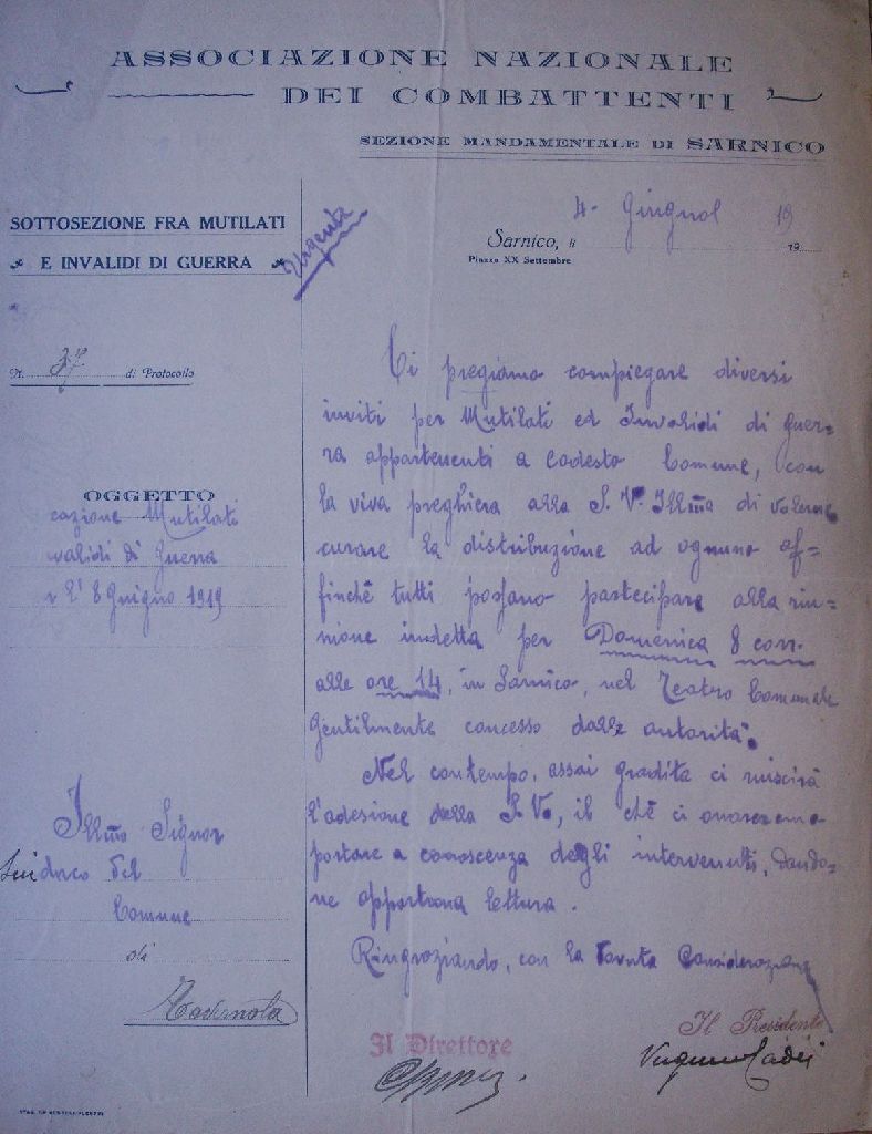 | 103) 04-06-1919 L'Associazione Combattenti e reduci di Sarnico convoca a riunione i militari mutilati e invalidi | 04/11/2006 |